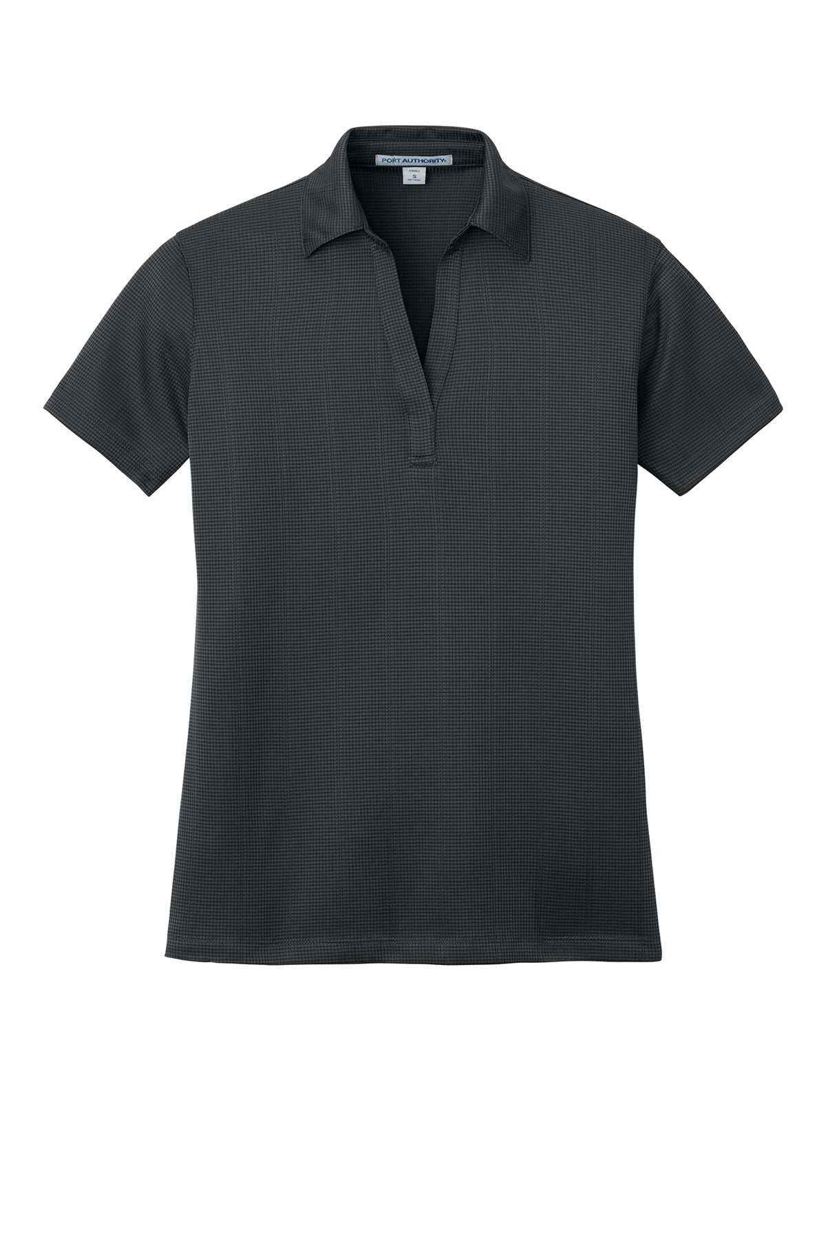 Lightweight and breathable, this moisture-wicking shirt has a pleasing drape, subtle jacquard texture and an open placket for feminine style.